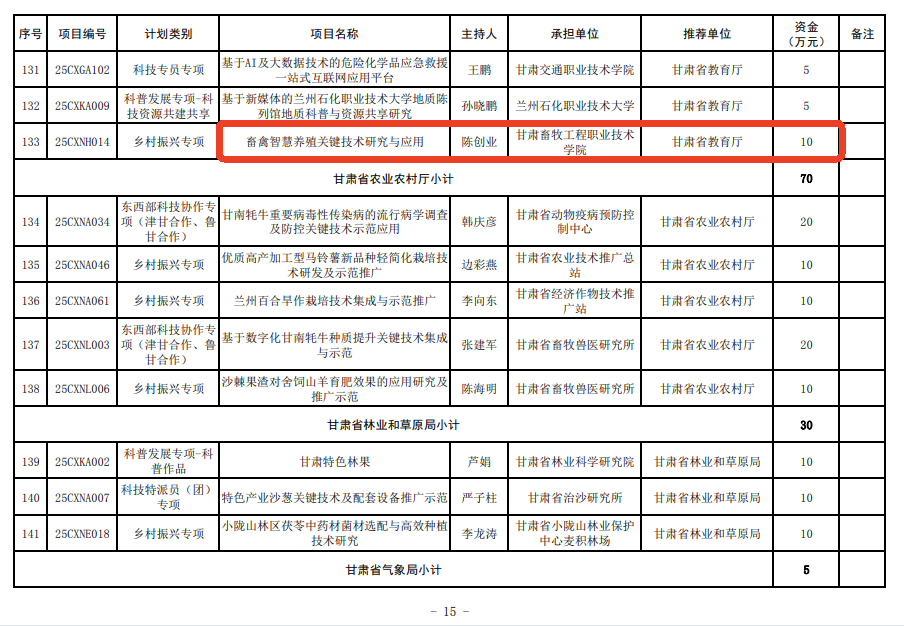学院一科研项目获得2025年度省科技厅乡村振兴专项项目立项,获批专项经费10万 来源: 发布时间:2025-04-23 09:34:00 浏览次数: 次 【字体:小 大】 终审:科技服务处 分享到: 【打印正文】