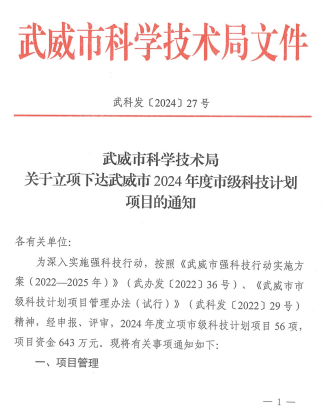 学院一项科研项目获武威市2024年度市级科技计划项目立项