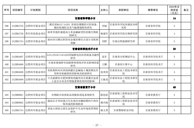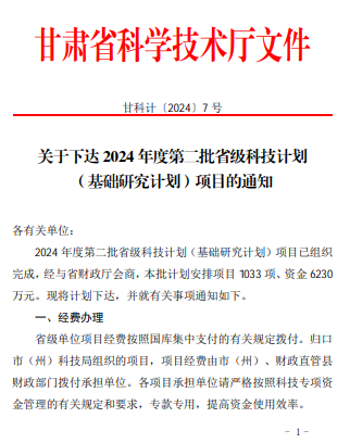 学院两项科研项目获甘肃省科技厅2024年度第二批省级科技计划(基础研究计划)项目立项 来源: 发布时间:2024-08-25 18:14:00 浏览次数: 次 【字体:小 大】 终审:科技服务处 分享到: 【打印正文】