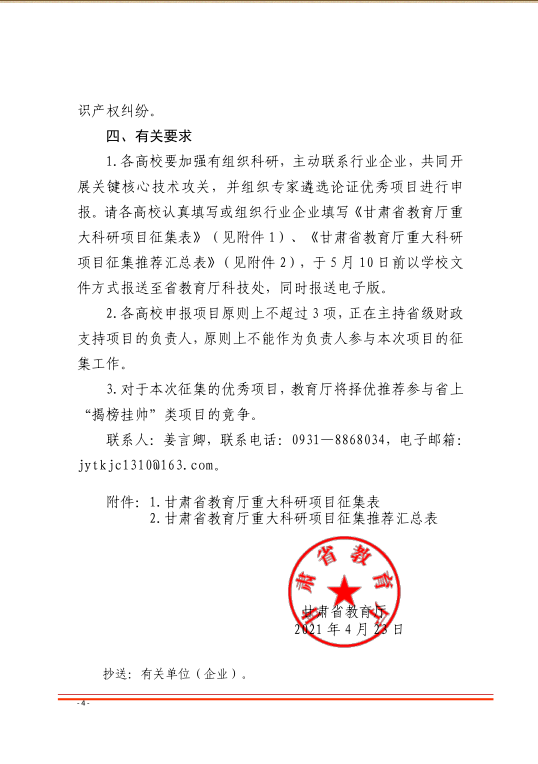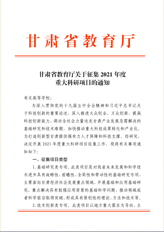 甘肃省教育厅关于征集 2021 年度 重大科研项目的通知 来源: 发布时间:2021-04-28 17:14:00 浏览次数: 次 【字体:小 大】 附件1.甘肃省教育厅重大研究项目征集表(1).doc附件2.甘肃省教育厅重大研究项目征集推荐汇总表(1).doc 终审:科技服务处 分享到: 【打印正文】